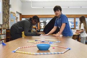 With a real-world story of Zipline drones as inspiration, pairs of students were tasked with using paper straws, rubber bands, tape, and wooden spoons to strategically construct catapults in a competition to see who could most accurately launch small rubber ducks into two targets in the Chapman room. Utilizing their knowledge of mechanical energy and projectile motion, teams needed to design mechanisms that could provide both power and accuracy. As each team worked on their catapult, Kieron walked around to give them tips on general design, structural integrity, and ways to maximize potential energy for further launches. Students came up with some smart designs—many were medieval trebuchet-style, using a wooden spoon as a sling and human force as the counterweight to launch the ducks; others were crossbow-esque “ballista” designs utilizing a rubber band with high elastic potential energy to launch the ducks; some students opted not to do either of those, and made their own completely original designs! When everyone was finished building, they brought their catapults to the launch table to try and hit the two targets.