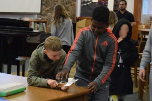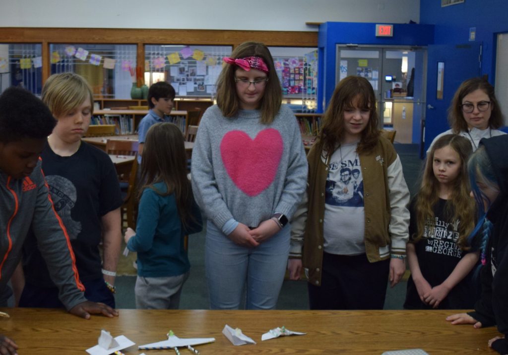 After his presentation, Kieron flipped the attention to the students, challenging them to engineer small “fling” planes that were to be miniature prototypes of their own sustainable aircrafts, with human force being the only fuel. Using 4 paper straws, 4 index cards, 2 rubber bands, and 2 paper clips each, in addition to tape, teams of students strategically constructed miniature airplanes in a competition to see whose could fly the furthest using only human force while still landing right side up. Each team had 20 minutes to design and build their planes, and then it was time to test them out in the open space of the Chapman Room. After a few failures, redesigns, and the construction of some creative catapults made out of pencils and straws, everyone’s fling planes were eventually able to complete decently long, successful flights!