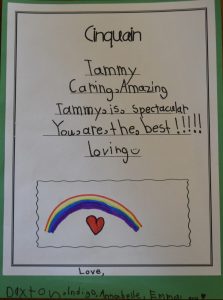 A cinquain poem from the 1st and 2nd grade to Tammy.
