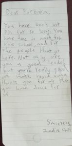 A heartfelt letter from Zadie (Grade 5) to Barbara thanking her for everything she’s done during her historically long tenure at PDS!