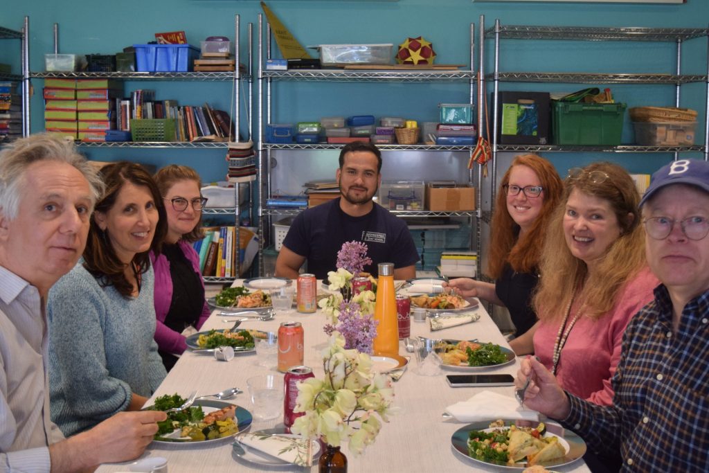 A group of faculty enjoy a delicious catered meal at the start of faculty and staff appreciation week. Left to right: Music teacher Ken McGloin, PreK/K teacher Andrea Istel, 4-5-6 and upper school STEM teacher Shira Teich, Spanish and After School teacher Christian Enrique Sauer, 1st and 2nd Grade teacher Amanda Thorndike, 3rd Grade teacher Lara Hiller, and Humanities and Drama teacher Stephen Haff.