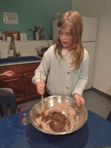 Greta (Grade 3) mixes ingredients for Michelle’s brownies in the Cozy Kitchen.